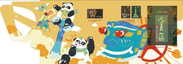 为弘扬古蜀文化,促进文旅融合发展,作为“天府三九大,安逸走四川”中的“三”和“大”,熊猫邮局与三星堆博物馆强强联手,从“传递美好”的寓意出发,选取三星堆青铜器物中典型的“纵目青铜面具”、“神鸟纹”、“鱼纹”、巴蜀图语等元素,重磅推出联名“一封穿越时空的神秘来信”邮折徽章套装,通过文化创意使其以更亲和可爱样方式带我们走近集邮文化和古蜀文化。