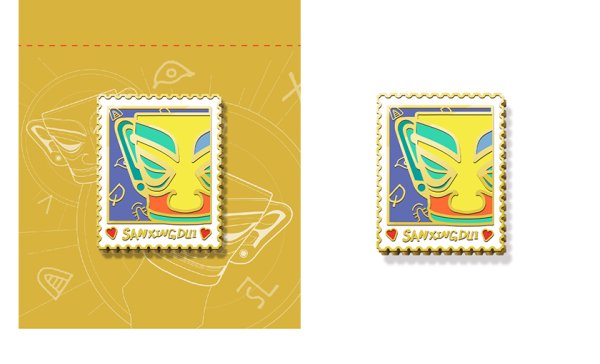 徽章采用掐丝珐琅工艺,以三星堆青铜人面像为原型,结合邮票锯齿边缘造型进行设计,完美地将三星堆文化与邮票元素相结合。