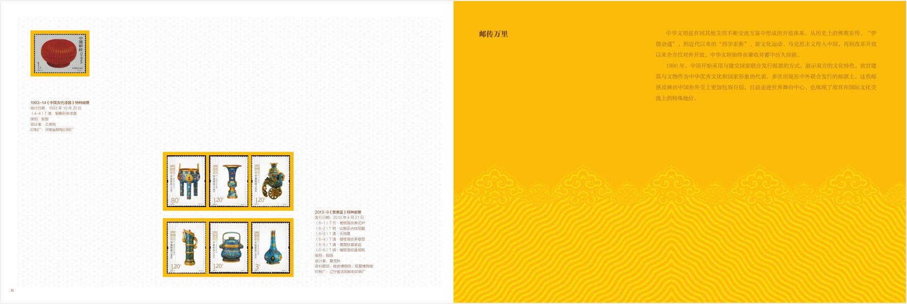 该产品分为“江山多娇”“美轮美奂”“大有既藏”“邮传万里”四个篇章,通过数十套邮票集中展示故宫博物院的建筑和馆藏文物。