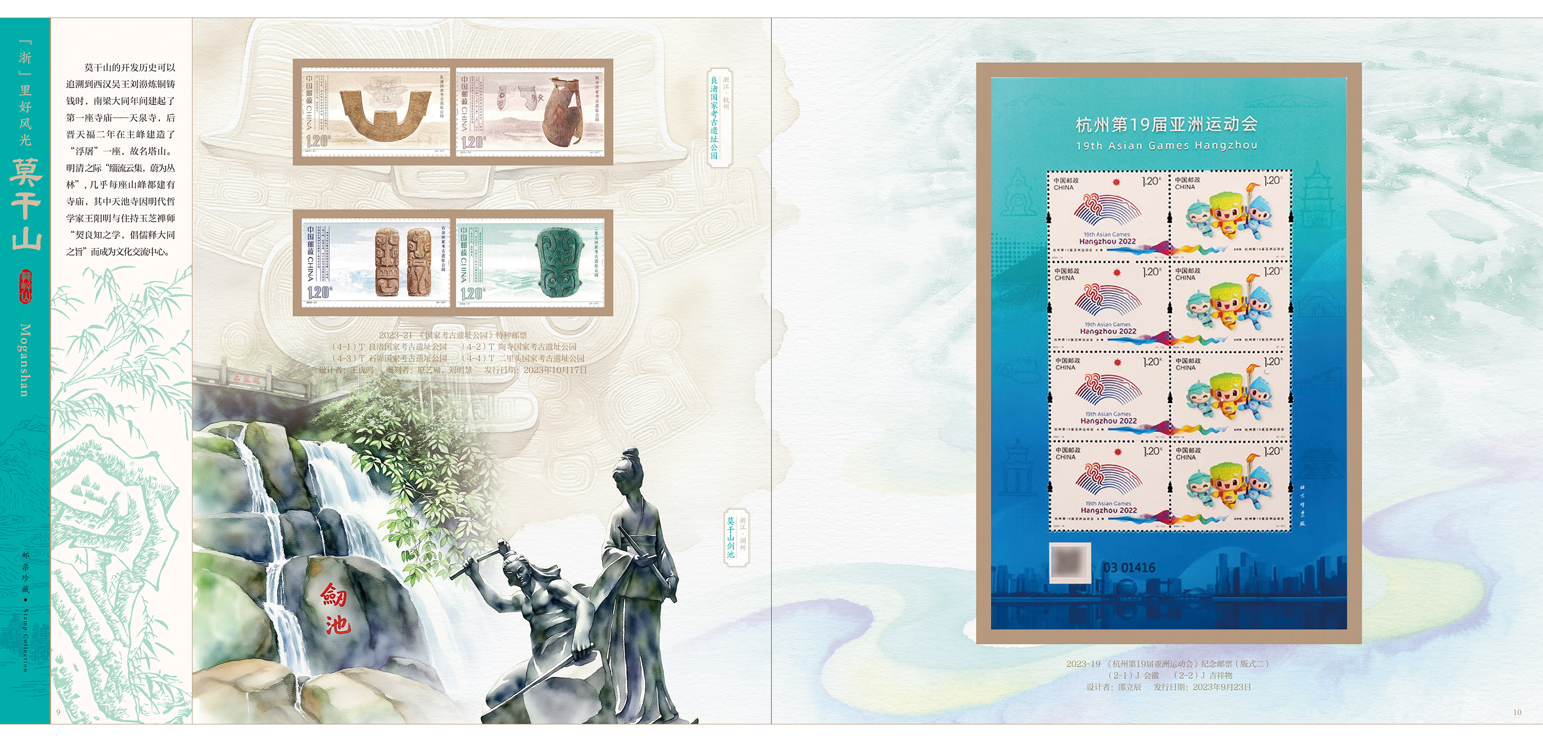 《莫干山》小版、《莫干山》方连、《国家考古遗址公园》、《钱塘江大潮》、《中国古镇(三)》小版、《杭州第19届亚洲运动会》小版、《竹》主图个性化邮票原票、《浴马图》、《水乡古镇》(图4)、《茶》(图1、2),以及《莫干山》首日封和《莫干山首发式》纪念封各一枚。
