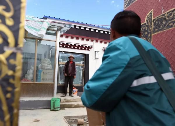 格桑次仁走进普玛江塘乡沙空村为一户村民送邮包(7月27日摄)