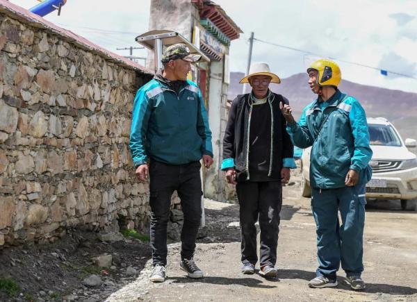 次仁曲巴(左一)和格桑次仁(右一)在普玛江塘乡沙空村投递邮件时和当地村民聊天(7月27日摄)