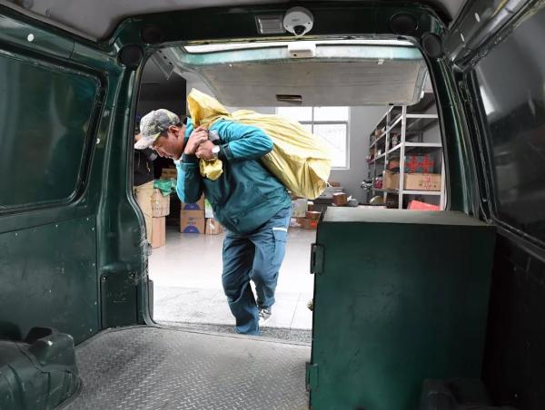 投递员次仁曲巴向邮车内搬运需要投递的包裹(7月23日摄)