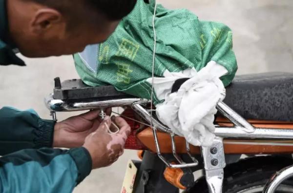 为了防止道路颠簸损坏邮包,投递员格桑次仁将邮包牢固地捆扎在摩托车的尾部(7月23日摄)