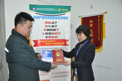 自11月29日起,陕西省西安市不动产登记服务中心正式受理群众的不动产权证书邮寄业务,群众在办理二手房交易、房屋抵押注销、权属登记等业务时可提出邮寄服务申请,证书制作完成后可由EMS送达。这是西安市邮政寄递事业部切入政府便民惠民工作、实现邮政便民服务的又一次拓展。图为西安市不动产登记服务中心的工作人员将第一件要邮寄的证书交到EMS工作人员手中。 □张雪珂 摄影报道