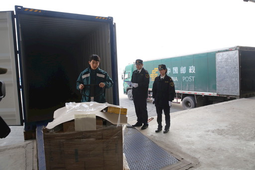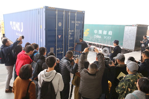 在海关工作人员及众多媒体的见证下,运邮集装箱开箱。