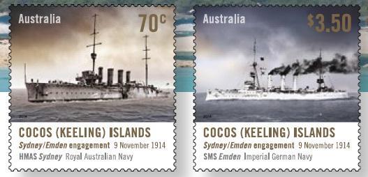 | 内容: | 2014年10月14日,澳大利亚邮政为可可斯群岛发行一套两枚纪念邮票,纪念一百年前在这里发生的海战。1914年11月9日,澳大利亚海军的悉尼号轻型巡洋舰在可可斯群岛海域与德国的埃姆登号轻型巡洋舰发生遭遇战,悉尼号获胜,这也是第一次世界大战开战后澳大利亚海军的首战。当时的埃姆登号的米勒舰长率舰穿越巽他海峡驶往可可斯群岛,他的目标是摧毁在迪雷克申岛东方电报公司无线电设施,以瘫痪协约国在印度洋上的通讯。 | |||