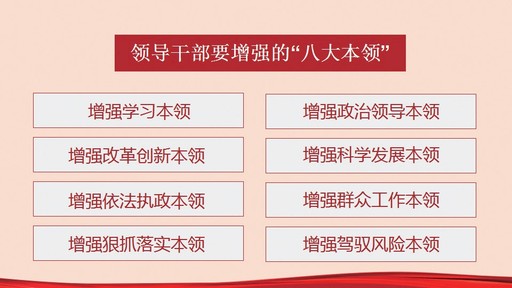 习近平总书记在党的十九大报告中提出:“领导十三亿多人的社会主义大国,我们党既要政治过硬,也要本领高强。”总书记在报告中强调提出,要增强“八大本领”。党课指出,“八大本领”是习近平总书记对所有党员领导干部提出的要求,希望大家牢记在心,在工作中经常对照、反复比较,不断提升自我。