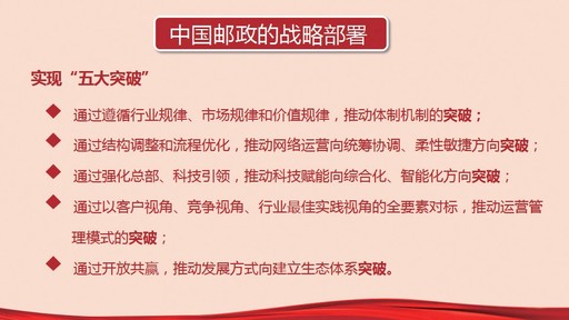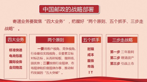 比如,对邮政寄递业务,我们的战略部署就是要聚焦“四大业务”,把握好“两个原则,五个抓手,三步走战略”。