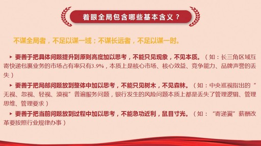 不谋全局者,不足以谋一域;不谋长远者,不足以谋一时。作为领导干部,要善于把具体问题提升到原则高度加以思考,不能只见现象不见本质,这是对一个领导的基本要求。长三角区域互寄快递包裹业务的市场占有率只有3.9%,本质上是核心市场的丢失、核心效益的丢失、竞争能力的丢失、整个声誉的丢失。要善于把局部问题放到整体中加以思考,不能只见树木不见森林。很多人觉得银行有风险在所难免,哪家银行没有坏账?但是我们要看风险的本质,看这个风险该不该发生?看有没有管理的逻辑、管理的要求?联系我们发生的一些风险问题,本质上看就是“不发生是偶然的,发生是必然的”,因为它缺失了管理逻辑、管理思维、管理要求,这样的问题就是极大的风险,我们要思考怎么去防范。一些看似偶然的事情,实际上是必然要发生的,就是一个“灰犀牛”,我们要时刻警醒,不要习以为常。风险不发生则已,一发生就像“大象跑进了瓷器店”,非毁了我们的事业不可。要善于把当前问题放到过程中加以思考,不能急功近利,鼠目寸光。“寄递翼”薪酬改革问题,我们要按照行业规律办事。