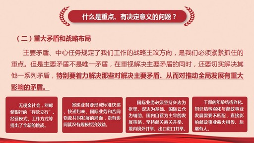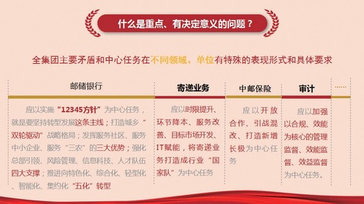 比如,邮储银行面临哪些挑战?寄递业务面临哪些挑战?保险业务面临哪些挑战?我们的普遍服务面临哪些挑战?了解了这些主要矛盾,还要明确解决的方案和具体措施,明确我们的中心任务。比如对邮储银行,我们提出要以实施“12345”的工作思路作为中心任务,就是要坚持转型发展这条主线,打造城乡“双轮驱动”战略格局,发挥服务社区、服务中小企业、服务“三农”的三大优势,强化总部引领、风险管理、信息科技、人才队伍四大支撑,推进向特色化、综合化、轻型化、智能化、集约化“五化”转型;对寄递业务,要以“时限提升、环节降本、服务改善、目标市场开发、IT赋能”的思路,将寄递业务打造成“国家队”作为中心任务;对中邮保险,要以开放合作、引战混改、打造成新的增长极作为中心任务。还有审计工作,要以加强以合规、效能为核心的管理监督、效能监督、效益监督为中心任务。