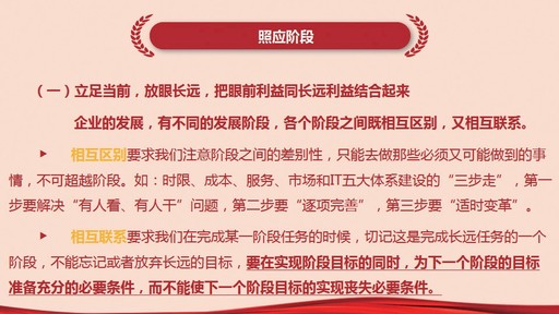 “照应阶段”一是立足当前、放眼长远,把眼前利益与长远利益结合起来。企业发展有不同的阶段,每一个阶段既相互区别,又相互联系。