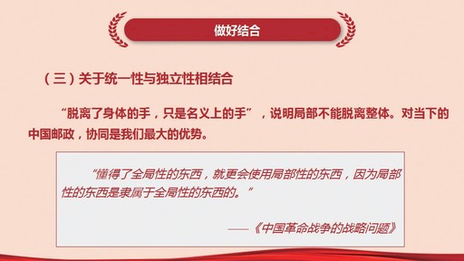 三要做到统一性与独立性相结合。哲学里说,“脱离了身体的手,只是名义上的手”。手是干什么用的?要抓东西,要吃饭,要劳作,但脱离了身体的时候,这些功能都没有了,只是名义上的一个手。所以,局部不能脱离整体,独立性与统一性要相结合。同样道理,对当前的中国邮政来说,协同是我们最大的优势,邮储银行和中邮保险一旦脱离了中国邮政,就失去了中国邮政的网络优势、协同优势和品牌优势,难以很好地生存。因此,看待问题、分析问题、解决问题都要做到统一性与独立性相结合,通过不同的视野、站在不同的角度看待问题,得出来的结论是完全不一样的。