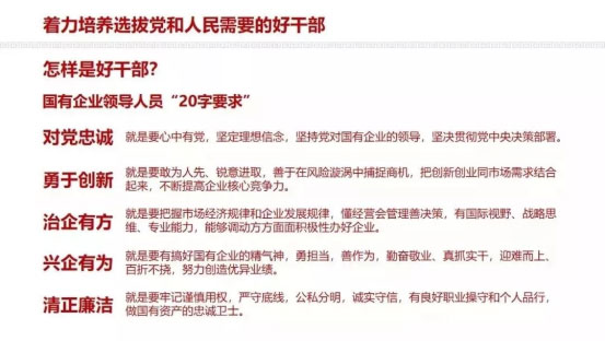 在全国国有企业党的建设工作会议上,习近平总书记对国有企业领导人员提出了对党忠诚、勇于创新、治企有方、兴企有为、清正廉洁的“20字要求”。刘爱力在领学时表示,中国邮政将习近平总书记对国有企业领导人员的“20字要求”作为选拔干部、培养干部、考核干部的根本遵循,严格贯彻执行《党政领导干部选拔任用工作条例》,坚持好干部标准,把政治标准放在第一位。