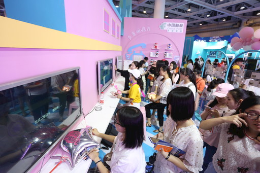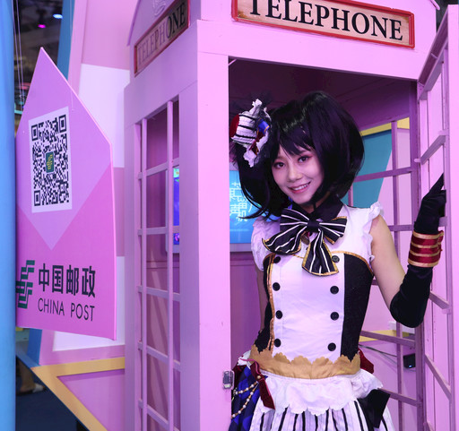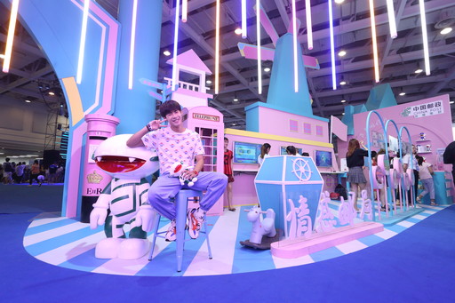 以浅蓝、粉红为主色调的邮政展区拨动了无数少女的心,cosplay模特也前来体验。