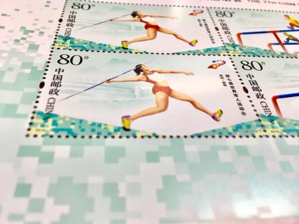 《军运会》纪念邮票采用凹印的方式印制,和其他体现运动题材的邮票一样,此套邮票图稿一眼看上去设计简单明快,标枪、障碍跑、航海技术、造型跳伞,军人坚韧硬朗的气质一览无余,以绿为主色调,淡淡的迷彩延伸到整版的空白区域。