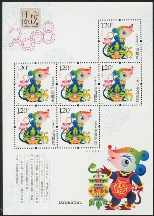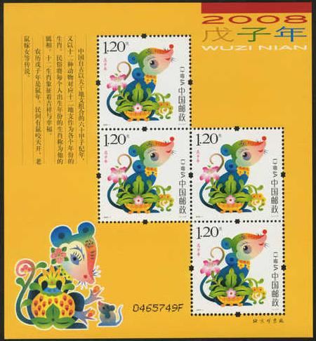 注:同时发行《戊子年》邮票版式三(整张枚数:4枚;整张规格:120×130毫米),作为2008年纪特邮票全额交款预订户赠品。