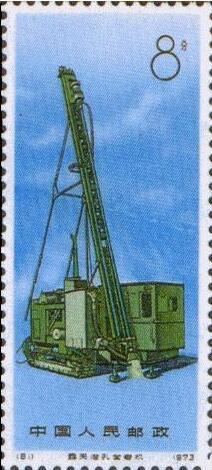 编81,8分,“露天潜孔凿岩机”。图案纵向设计突出了凿岩机高耸的钎杆。背景是融为一体的蓝色天空和大地。