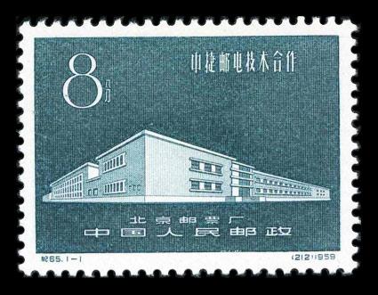 1959年8月15日,为庆祝中捷两国在北京邮票厂筹建工程中技术合作的成功,我国邮电部发行“中捷邮电技术合作”纪念邮票,编号纪65,全套1枚。图案采用北京邮票厂外景,画面采用深绿色衬底,既是中国邮政的专用颜色,具有标志性,也寓意中国邮政事业的繁荣发展。