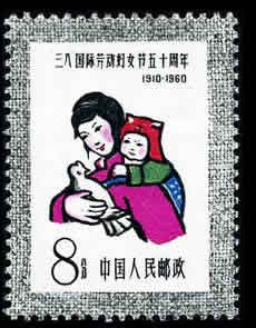 第二枚“保卫母亲、保卫儿童”,为一位怀抱鸽子、背负儿童的母亲形象,表达了只有和平才能保卫妇女儿童幸福的主题。