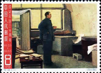 第一枚“决战前夕”,图案是身穿灰蓝色大棉衣,右手叉腰,左手拿着香烟的毛泽东同志,他面对窑洞墙壁上的军事地图,聚精会神地思索着,展现了革命领袖胸中自有雄兵百万、运筹于帷幄之中的博大胸怀。