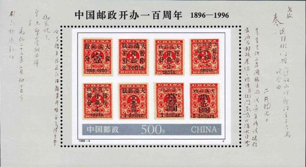 国家邮政局1996年3月20日发行《中国邮政开办一百周年》纪念邮票1套4枚,小型张1枚。