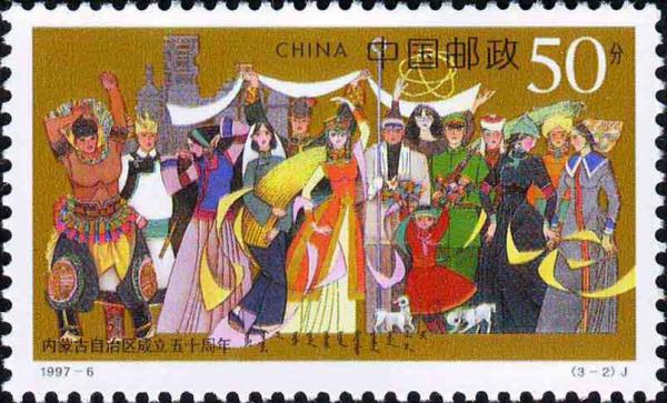 国家邮政局1997年5月1日发行《内蒙古自治区成立50周年》纪念邮票1套3枚。