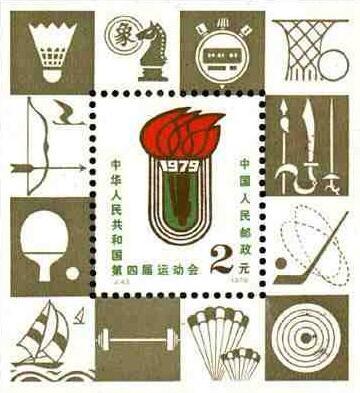 1979.9.15,影写版,P11.5。有背胶。小型张规格:57*62mm。邮票规格:26*31mm。卢天骄。北京邮票厂。 本枚小型张画面为第四届全运会会徽。邮票正中为由红色火炬和金色跑道构成的全运会会徽,“1979”标志嵌于火炬炬盘,十分醒目。周围饰以浅绿色各项体育运动的器械图案,素雅大方,简洁明快。