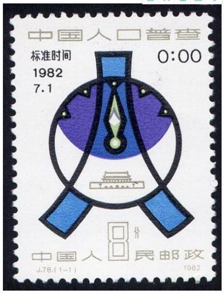 本套邮票共1枚。为“人”字和时钟。画面上端分别印有“标准时间1982.7.1”和“0∶00”字样,这是第三次人口普查的标准时间。所谓人口普查的标准时间是指由国家规定的作为普查登记人口状况统一时间的某一年、月、日中的某一时点,它可以保证人口普查资料的准确性。画面上与标准时间相适应的是一个时针,时针指向零点。另外,一个“人”字形图案与时针叠合在一起。这一图案既指明了人口普查的有关信息,同时又使人产生一种中国人口数量过于庞大的紧迫感。中国从70年代以来就开始注意到人口不能无计划增长,开始实行计划生育政策。至80年代,更是广泛宣传计划生育政策,将其作为中国的一项长期的基本国策。中共中央和国务院于1980年发出致全体党员、共青团员的公开信,提倡一对夫妇只生一个孩子,并提倡晚婚、晚育、少生、优生。