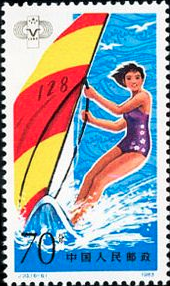 6-6为“帆板”。这是第一次被选入综合运动纪念邮票的体育项目。一位女子帆板运动员在海面滑行。