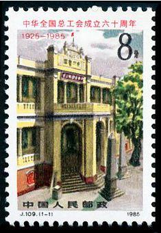 中华全国总工会,是中国共产党领导下的全国工会的最高领导机关,中国共产党联系工人阶级的纽带,1925年5月在广州成立。1927年转入地下,领导工人运动。中华人民共和国成立后,该组织的职能转变为教育和组织中国工人为实现中国共产党在社会主义革命和建设中的路线,为建设社会主义现代化强国而奋斗。中华全国总工会是中华人民共和国主要的群众团体之一,机关报是《工人日报》。为纪念中华全国总工会成立60周年,中国邮电部于1985年“五一”国际劳动节发行了这枚邮票。