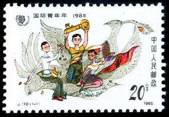 本套邮票共1枚,为“国际青年年”。邮票借鉴了某些童话描绘形式,大胆采用了夸张抽象的漫画形式。图中三个青年乘坐吉祥大鸟在空中遨游,他们把希望的种子播向大地,用智慧的钥匙打开科学技术的殿堂,用勤劳的双手使生活丰富多采。整个画面与“国际青年年”的主题——“参与、发展、和平”完全融合。吉祥鸟的造型借鉴了鸽子的形象,白色象征着圣洁、清纯,反映了各国青年向往和平、让世界充满爱的美好的愿望。男女青年的形象活泼生动,线条跳跃流畅,色彩明艳绚丽,很好地体现了青年人的蓬勃朝气和无穷无尽的创造力。主题图案既充满浪漫色彩,又很富装饰效果,在同类邮票的设计中不可多得。