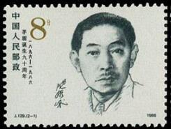 1986.7.4。 影写版。P11*11.5。 40mm*30m。 50(5*10)。 [G]。吴长江。北京邮票厂。 2-1为“茅盾头像”。 2-2为“茅盾的工作像”。画面背景是茅盾的《子夜》手迹。