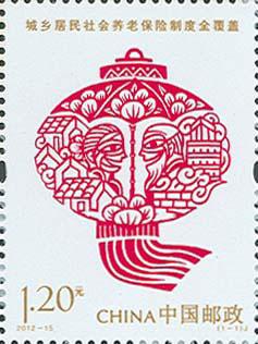 中国邮政2012年7月1日发行《城乡居民社会养老保险制度全覆盖》纪念邮票1套1枚。