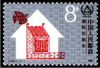 本套邮票图案主要由 红、白、灰三色组成。设计者陈幼林采用民间剪纸的形式,以红色的房屋剪纸作主图, 看上去十分醒目,突出了“住房年”的主题。灰色砖形纹样的背景,使整个画面显得朴实、雅静、安稳,表现了中国目前许多住房建筑的民族风格。在主图和背景之间,配以白色屋形,增加了主、次之间的层次感,也更突出了主图。在主图中,房屋的栅栏伸入白底和砖纹图样,不致使人产生各部分分离的感觉,使整个画面有机地结合起来。同时,又以红喜鹊的剪纸造型来表达人们 渴望得到环境舒适的住房的愿望,同时也象征着吉祥如意。此外,图案上国际住房年徽志和文字的安排也井然有序。