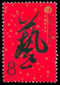 邮票的主体形象 选用中国北宋著名书画家米芾的行书“艺”字,使介于具象 和抽象之间的汉字特色在这里得到恰到好处的发挥。在画面设计上,设计者以沉稳的 大红色作衬底,并在衬底上以散金装饰,烘托出浓烈的节日 气氛。用中国传统的书法艺术和传统的色 彩相配合,使这枚邮票的中国风格更浓更浓。