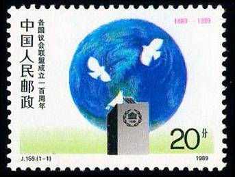 本套邮票图案主体是融为一体的地球与和平鸽。洁白的鸽子飞翔在地球各地,象征该组织为 促进世界和平而努力,期望世界人民共同合作,解决国 际间存在的各种问题。图案下端是绿色的大地,大地矗立着一座议会联盟的讲台,讲台标有联盟的会徽和 “1989”字样。海蓝色渲染的地球,翻卷着若隐若现的云影;绿色的大地与洁白的和平鸽;红色的 “1889-1989”红色字样。色彩的运用,给人一种和谐、静谧、安详的感受,展示出人类世界充满希望的远景。