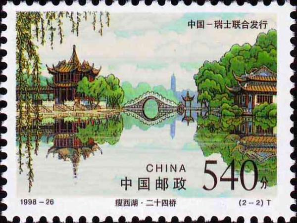国家邮政局定于1998年11月25日发行《瘦西湖和莱芒湖》特种邮票1套2枚。(中国-瑞士联合发行)