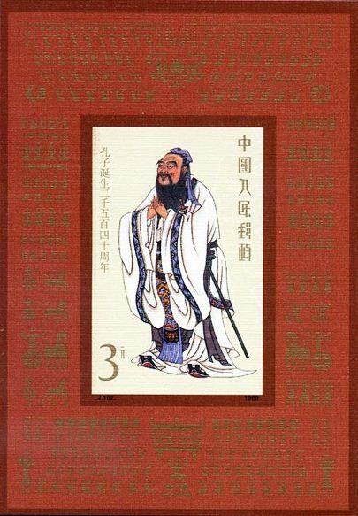 小型张画面为“孔子像”,是以唐代吴道子所绘孔子形像为基础,综合孔府收藏的历代所绘孔子像设计而成。边饰图案为古代学校的教学内容中的“六艺”,即礼、乐、射、御、书、数。