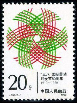 1990.3.8。影写版。P11.5*11。30mm*40mm。 50(10*5)。[G]。许洪茹。北京邮票厂。 本套邮票共1枚。邮票的图案用抽象的循环往复、富有节奏的红绿线条来编织图案。