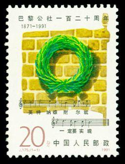 本套邮票是中国发行的第三套纪念巴黎公社的邮票。设计者突破了以往以历史画面、照片再现当年斗争场景的形式。画面以公社社员墙为背景,并把墙绘成巴黎公社旗帜的形状,中心悬挂长青的桂叶花环表示纪念。下面是《国际歌》最后一句的五线谱曲和歌词:“英特纳雄耐尔就一定要实现”。邮票艺术语言凝炼,构思含蓄隽永,画面新颖别致,格调庄严肃穆,突出、鲜明地体现了“公社精神永存”的主题。