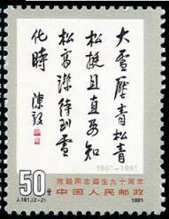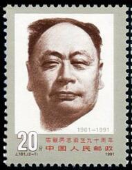 1991.8.26。影写版。P11.5*11。 30mm*40mm。50(10*5)。 [G]。 李印清。北京邮票厂。 第1枚是陈毅的标准像。 第2枚选用了陈毅手书的一首诗稿,诗如其人,这首诗作为陈毅为人的写照而广为人知。