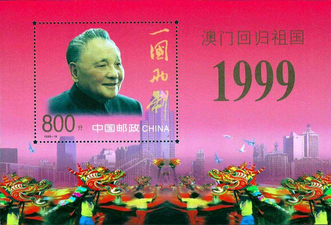 国家邮政局1999年12月20日发行《澳门回归祖国》纪念邮票1套2枚,小型张2枚。