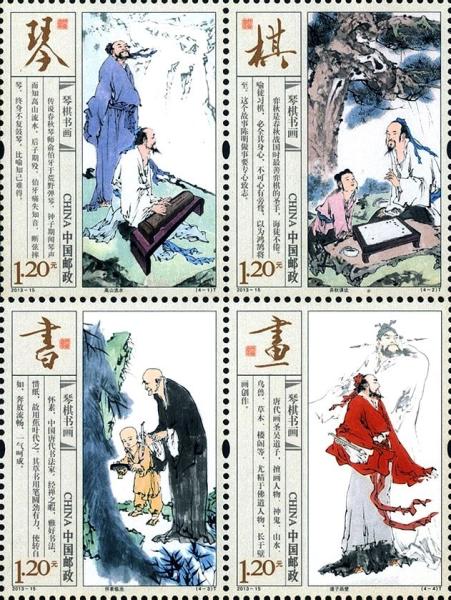 中国邮政2013年7月13日发行《琴棋书画》特种邮票1套4枚。
