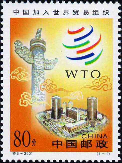 国家邮政局于2001年12月11日特别发行《中国加入世界贸易组织》邮票1套1枚。
