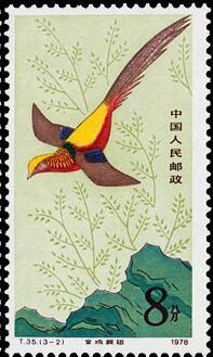 (1) 4分 竹石金鸡 800万枚 (2) 8分 金鸡展翅 800万枚 (3)45分 金鸡觅食 200万枚 1979.1.25。 影写版。P11.5。 31mm×52mm。 40(10×4)。刘硕仁。北京邮票厂。