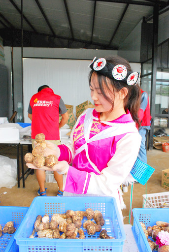 漂亮的纳西族女孩正在展示自家的松茸,她身后是正在忙着封箱的邮政员工。高兴槐 摄