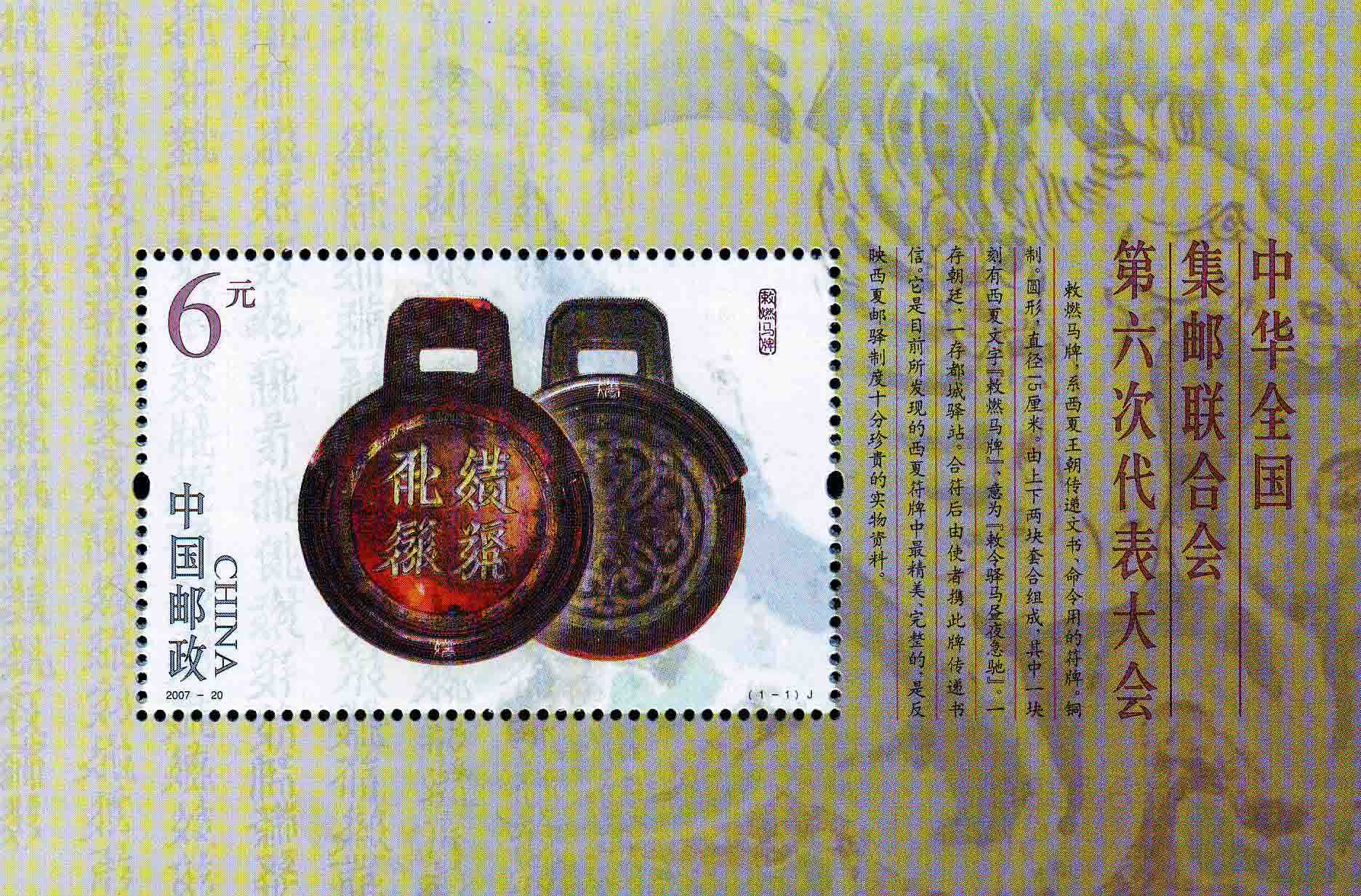 P.S. 此枚纪念邮票小型张内容为敕燃马牌,敕燃马牌是西夏王朝传递文书、命令用的符牌。铜制。圆形,直径15cm。由上下两块套合组成,其中一块刻有西夏文字“敕燃马牌”,意为“敕令驿马昼夜急驰”。一存朝廷,一存都城驿站。合符后由使者携此牌传递书信。它是目前所发现西夏符牌中最精美、完整的,是反映西夏邮驿制度十分珍贵的实物资料。