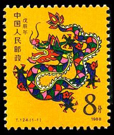 8分, 龙, 12391.65万枚。 1988.1.5。影雕套印。P11.5。26mm×31mm。80(8×10)。 [D]祖天丽。[E]群峰。北京邮票厂。