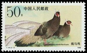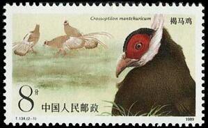 (1)8分, 英姿, 2537万枚。 (2)50分, 双栖, 1568.4万枚。 1989.2.21。影写版。P11.5。52mm×31mm。40(4×10)。 万一。北京邮票厂。 褐马鸡和大熊猫一样是国宝,被誉为“东方宝石”。褐马鸡为鸟纲、雉科,亦称鹖鸟、角鸡。性情暴、健勇善斗,有置死不避艰险的品格。分布于山西省吕梁山的关帝、管涔山林区、河北省西北部小五台山林区。山西省已将褐马鸡定为省鸟。中国鸟类学会则把褐马鸡作为会标。